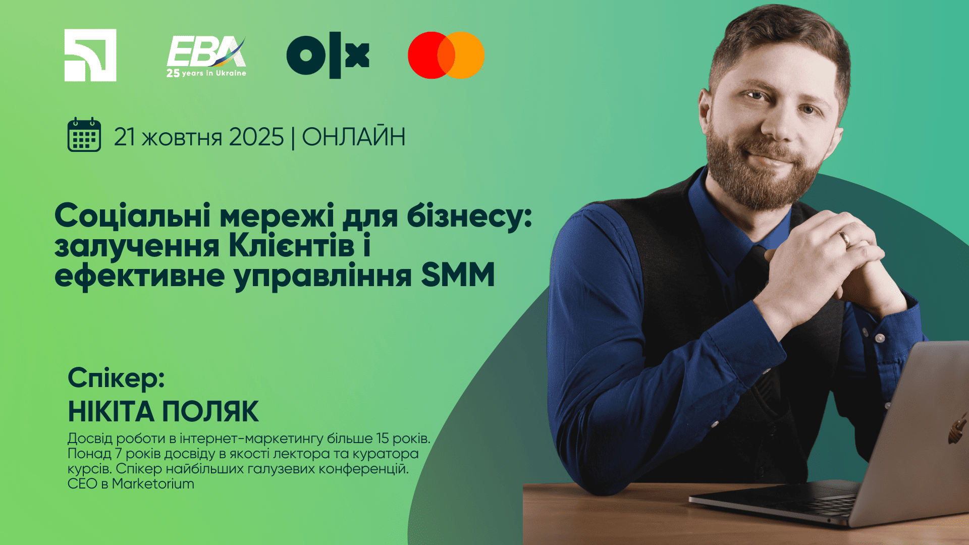 Спікер: Нікіта Поляк, досвід роботи в інтернет-маркетингу більше 15 років. Понад 7 років досвіду в якості лектора та куратора курсів. Спікер найбільших галузевих конференцій. Запрошений лектор багатьох маркетингових шкіл. Ділиться корисною та найцікавішою інформацією в соцмережах. Успішно вів та консультував більше 1200 Клієнтів, має успішний досвід роботи в різних проектах з маркетинговим бюджетом 0$ до 600,000$ на місяць. Працював як з маленькими нішевими бізнесами, так і зі світовими брендами.